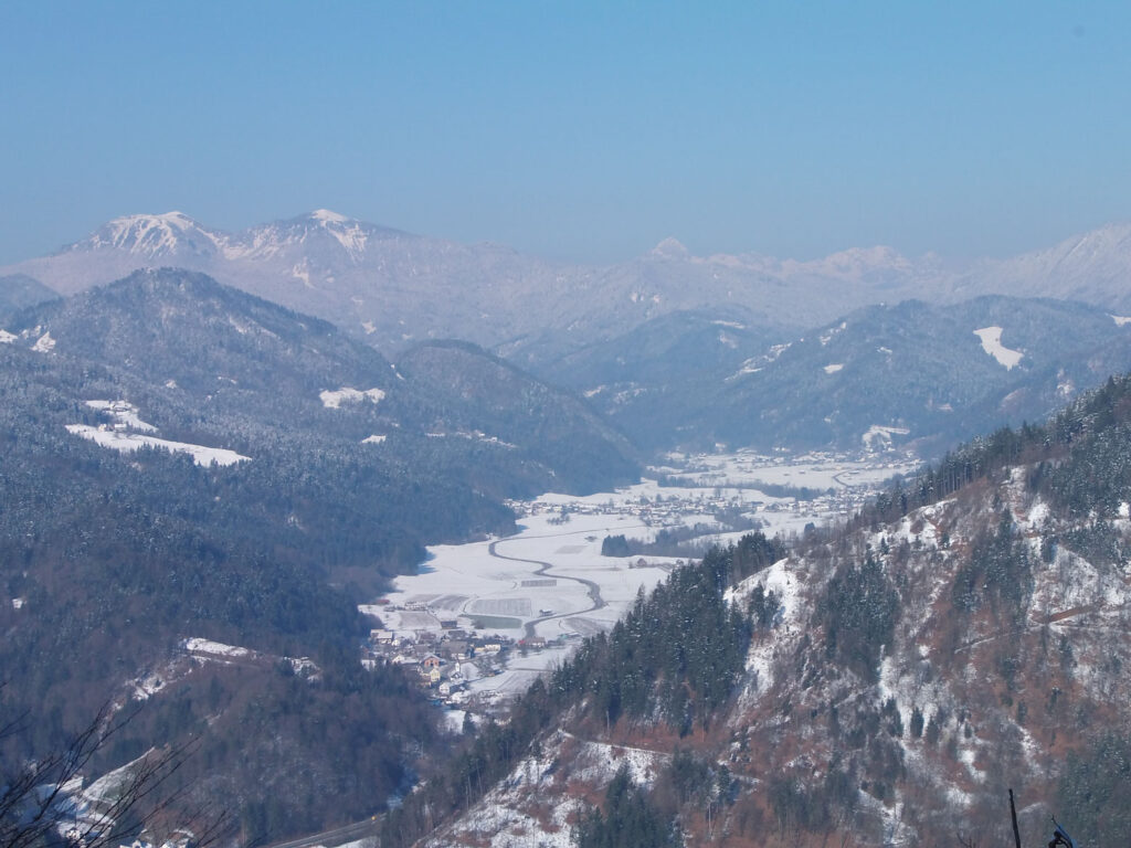 Das Landschaftsbild von Selzachertal Lack-Gebiet mit dem Berg Hohenek/Ratitovec, wo Eberhard Kranzmayer den deutschen Dialekt von Zarz in Oberkrain erforschte und dokumentierte.